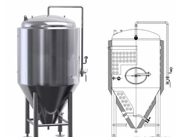 發酵罐的一個主要作用是發酵——從麥汁到成熟的啤酒的一個過程。所以對于溫度控制有相當嚴格的要求。一個好的發酵罐設計,首先需要考慮到溫控系統。對于溫控系統發酵罐的基本構造一般情況下分為四層,最里面是內膽,中間是通冷媒的夾套,夾套和內膽直接相連,膠套外面是發泡保溫層,保溫層外面就是我們看到的發酵罐外壁。冷媒通過向夾套內通進行循環來實現溫度控制。故夾套的面積多少影響溫控效果。不管是是盤管、米勒扳、夾套式等換熱面積最重要。另外保溫層的厚度以及保溫層里面打的發泡的均勻性很重要(夏天發酵罐發汗,就是保溫層沒有做好,引起來的)這樣不但節能,并且溫度比較容易控制。
